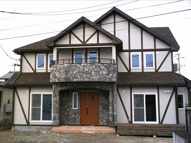 チューダースタイルの外観で、内部はオークのムクフロアと、調湿・消臭機能に優れた山火炭の塗り壁です。外観内観とも重厚感のある色使いです。