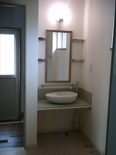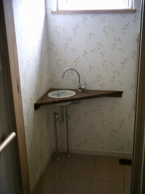 座って使い易い洗面台と、トイレの手洗い、どちらも輸入ボールを使った手作りです。