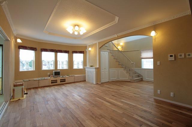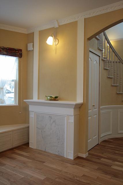 す、造付けのTV台にマントルピース風の飾り棚などが