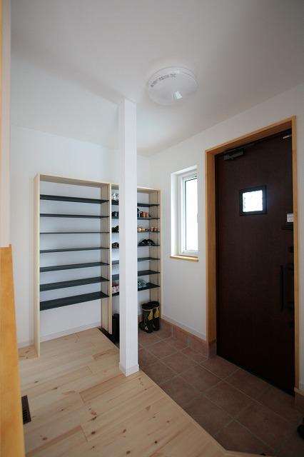 S様邸 1 S様邸、外観はフレンチスタイルのシンプルな外観です^^ 白い外壁に焦げ茶の屋根、破風、庇がポイントになってます 屋根は色褪めがなく雪が落ちないオークリッジプロです デザインと機能性を兼ね備えた優れ物ですよ^^ ギャラリー 階段は踏み板と蹴込み板の色を変えました^^縦格子の手摺で開放感が出てますねぇ〜 シューズクロークは土間収納兼用になってます^^濡れたものも置けて便利なんですよぉ〜^^