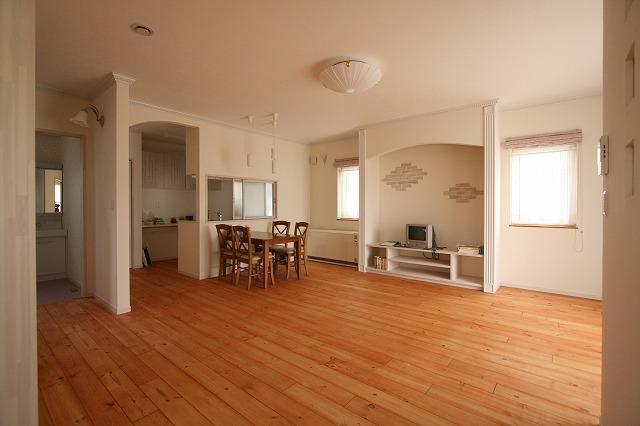 K様邸 ① 標準の外断熱と基礎断熱の施工にさらに、 壁の内側には羊毛断熱で施工しています。 W断熱で断熱性能も更に良くなっています☆ 長期優良住宅認定のお家です^^ ギャラリー 玄関はグラスファイバーの輸入のドアです^^ LDK 中央にはテレビ台を作りつけ♪ 事務所から持参したテレビは小さいですが> 壁をポイントでアールにしています☆ リビングは、調湿や消臭効果のある珪藻土の塗り壁です*