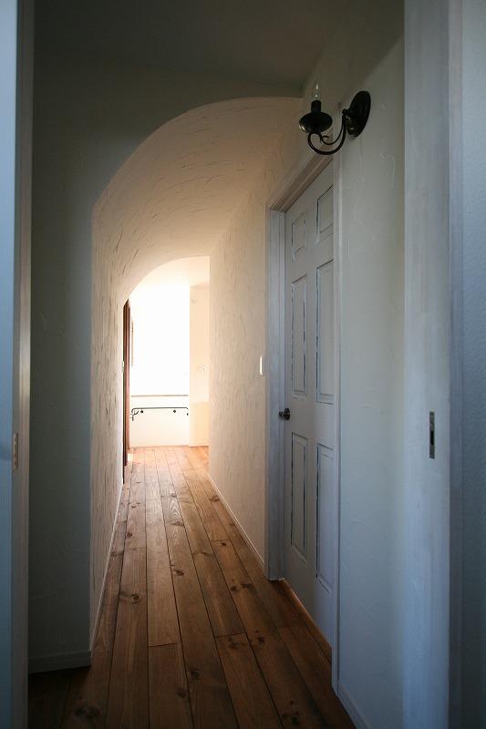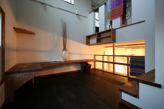 S様邸・・・3 ギャラリー 2Fの廊下はアールの天井になります ドアはエイジング塗装をしています☆ 中二階のパソコンスペースです☆ LDKも見渡せます オーダーの食器棚 キッチン周りはどうしても物が あふれてしまいますよね(>_