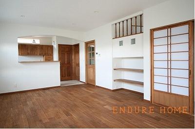 奥州市 K様邸 ・・ No.01 ギャラリー LDK キッチンの下がり壁をアールに 土間収納は、来客者に中が見えないように 配慮して造りました◎ ちょっとした収納かな?と扉を開けるとびっくり!!基礎空間も使い階段下を使った広々収納が♪