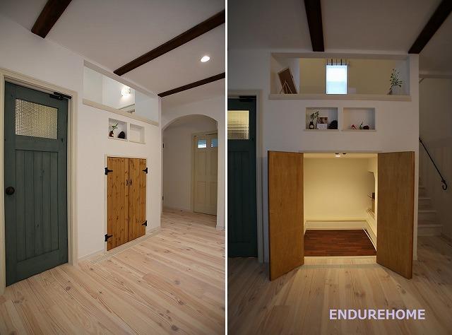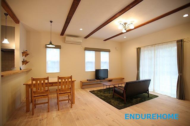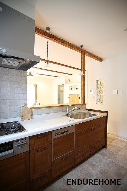 盛岡市 K様邸・・・① ギャラリー ナチュラルなウッドワンのキッチンを採用 付梁はアンティーク加工を施し、 おしゃれなアイアンパネルも 壁に埋め込みました☆ リビングダイニング 照明のシェードはグリーン カーテンも優しいグリーン.. 統一感が合って落ち着く空間です(*^^) リビングドアの隣の扉を開けてみると・・ 基礎空間を使った大容量の収納が!! 収納はいくらあっても助かりますね(^^)/