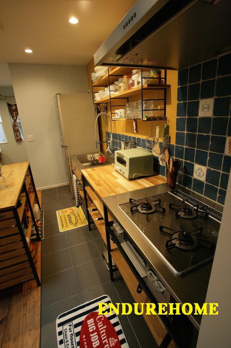 盛岡市 T様邸 ・・・No.1 ギャラリー オーナー様ひとめぼれのタイル♪水色とブラック、ホワイトのタイルをランダムに貼りました。 こちらのブルーのタイルひそかに人気です◎ コンロはガスでも電気でも可能です。 シンプルで絵が映えますね♪ オーナー様手作りの絵画が素敵です(*^^)v