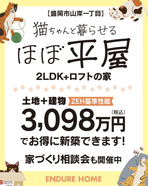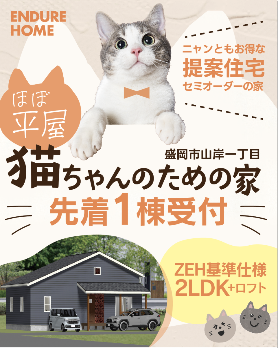 盛岡市山岸の土地に、猫ちゃんのための家をコスパよく建てれる限定プランが登場!